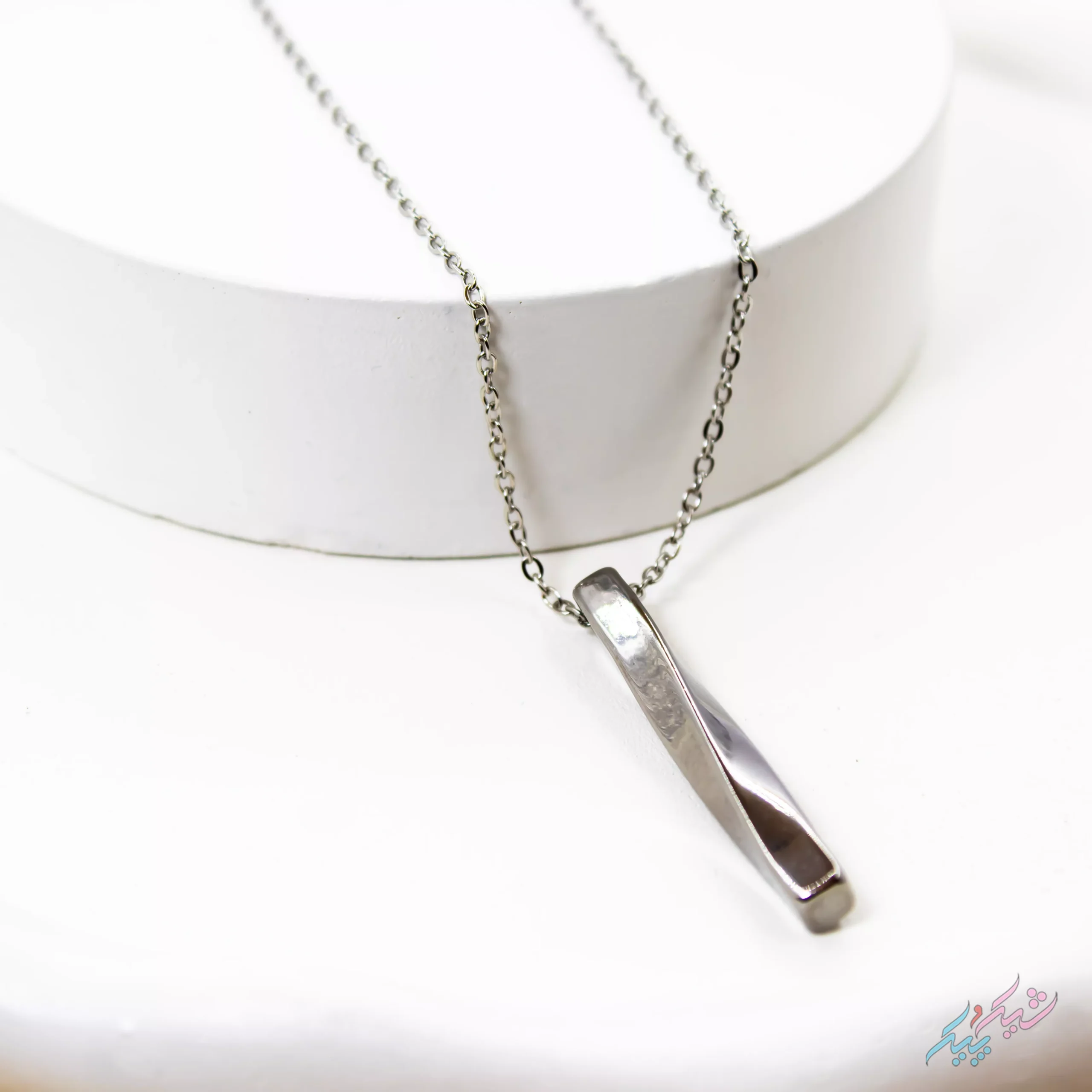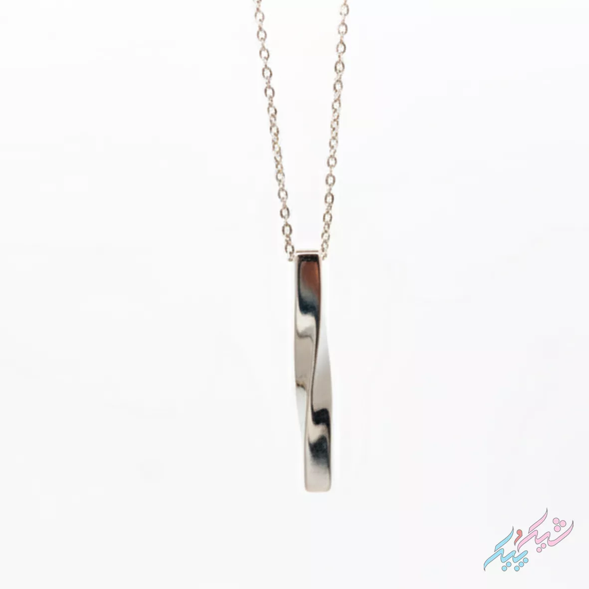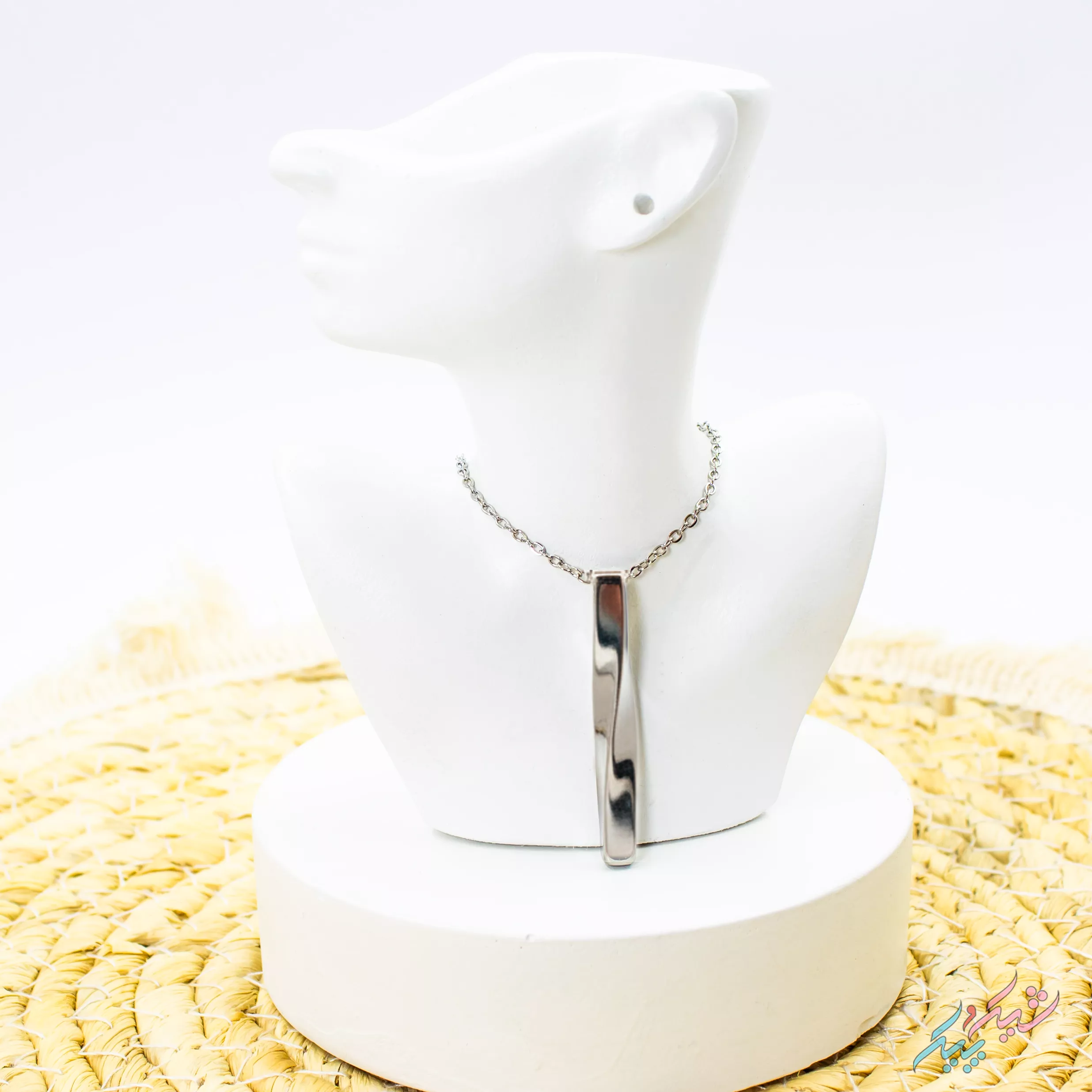 شکل و ظاهر این گردنبند بسیار خاص و معماری گونه است. آویز اصلی به شکل یک میله یا ستون بلند و باریک است که به صورت هنرمندانهای پیچ خورده و یک جلوه سهبعدی و دینامیک ایجاد کرده است. سطح آویز صیقلی و براق است و نور را به شکلی زیبا بازتاب میدهد. رنگ نقرهای یا استیل و رنگ مشکی براق آویز و زنجیر، جلوهای سرد و مدرن به این اکسسوری بخشیده و آن را برای سِت کردن با هر رنگ لباس و هر نوع جواهرات استیل/نقرهای دیگر مناسب میسازد. زنجیر گردنبند ظریف و محکم بوده و هماهنگی کاملی با آویز مینیمال دارد. این طراحی ساده و خطی، آن را به یک قطعه لطیف و در عین حال قوی تبدیل کرده است.