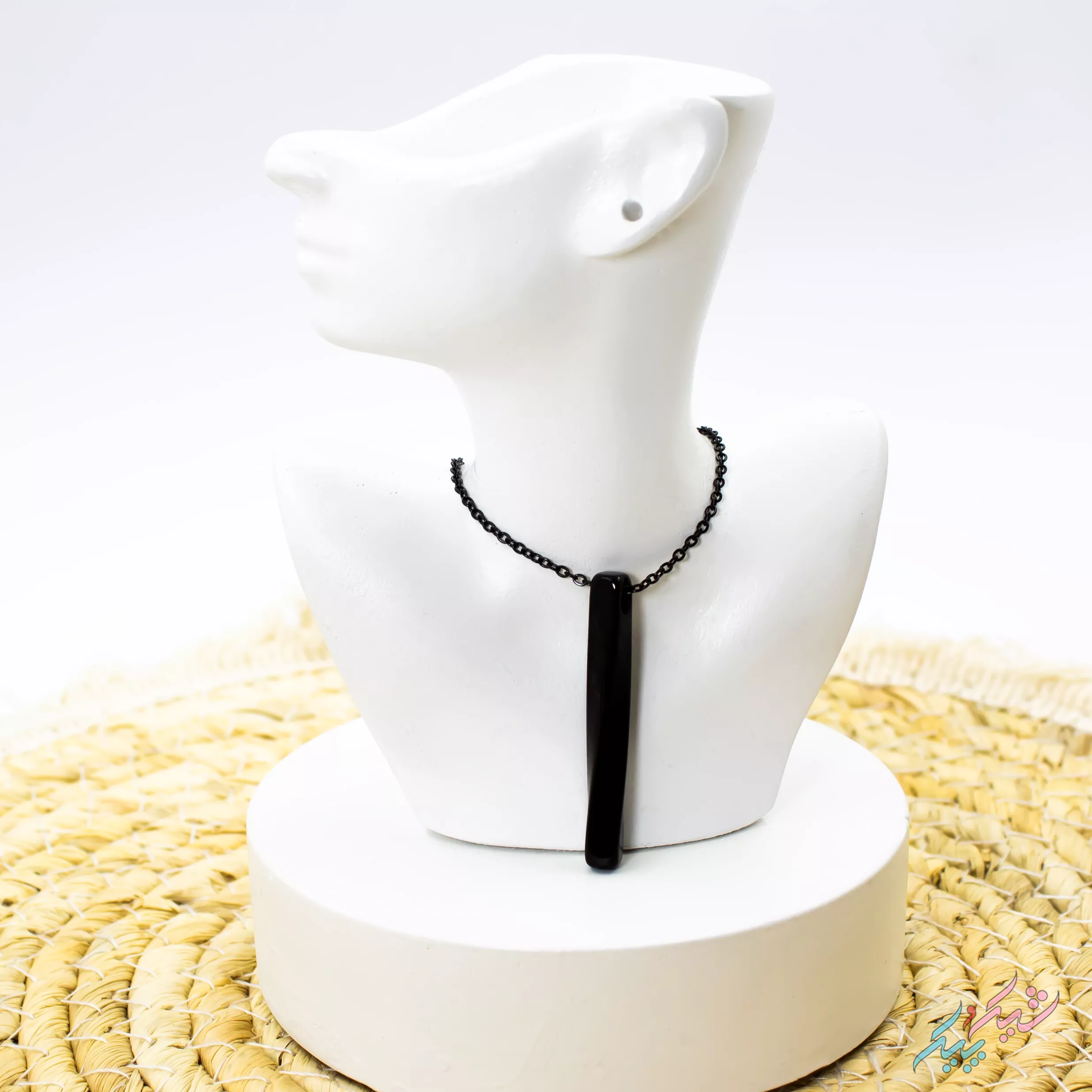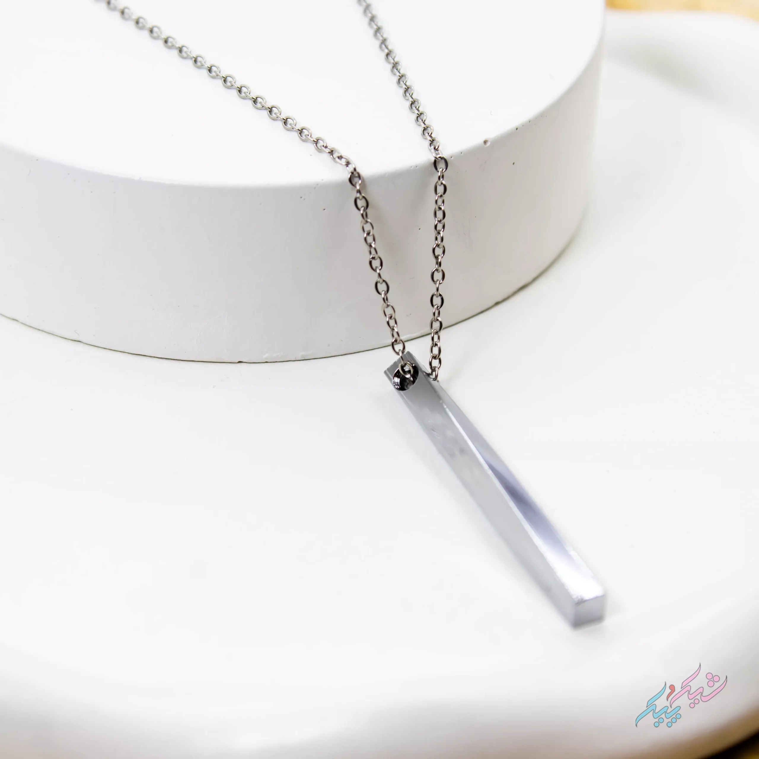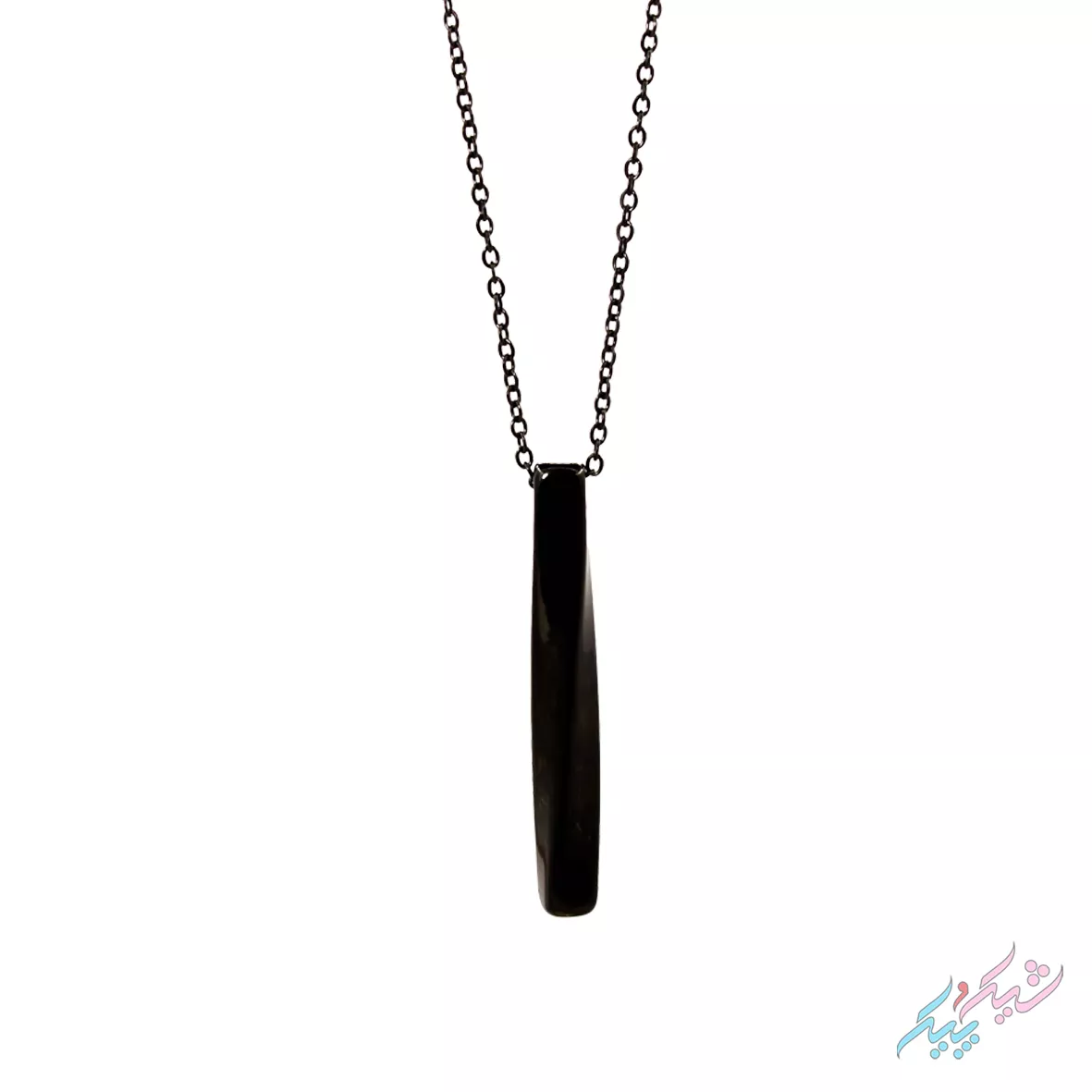 شکل و ظاهر این گردنبند بسیار خاص و معماری گونه است. آویز اصلی به شکل یک میله یا ستون بلند و باریک است که به صورت هنرمندانهای پیچ خورده و یک جلوه سهبعدی و دینامیک ایجاد کرده است. سطح آویز صیقلی و براق است و نور را به شکلی زیبا بازتاب میدهد. رنگ نقرهای یا استیل و رنگ مشکی براق آویز و زنجیر، جلوهای سرد و مدرن به این اکسسوری بخشیده و آن را برای سِت کردن با هر رنگ لباس و هر نوع جواهرات استیل/نقرهای دیگر مناسب میسازد. زنجیر گردنبند ظریف و محکم بوده و هماهنگی کاملی با آویز مینیمال دارد. این طراحی ساده و خطی، آن را به یک قطعه لطیف و در عین حال قوی تبدیل کرده است.