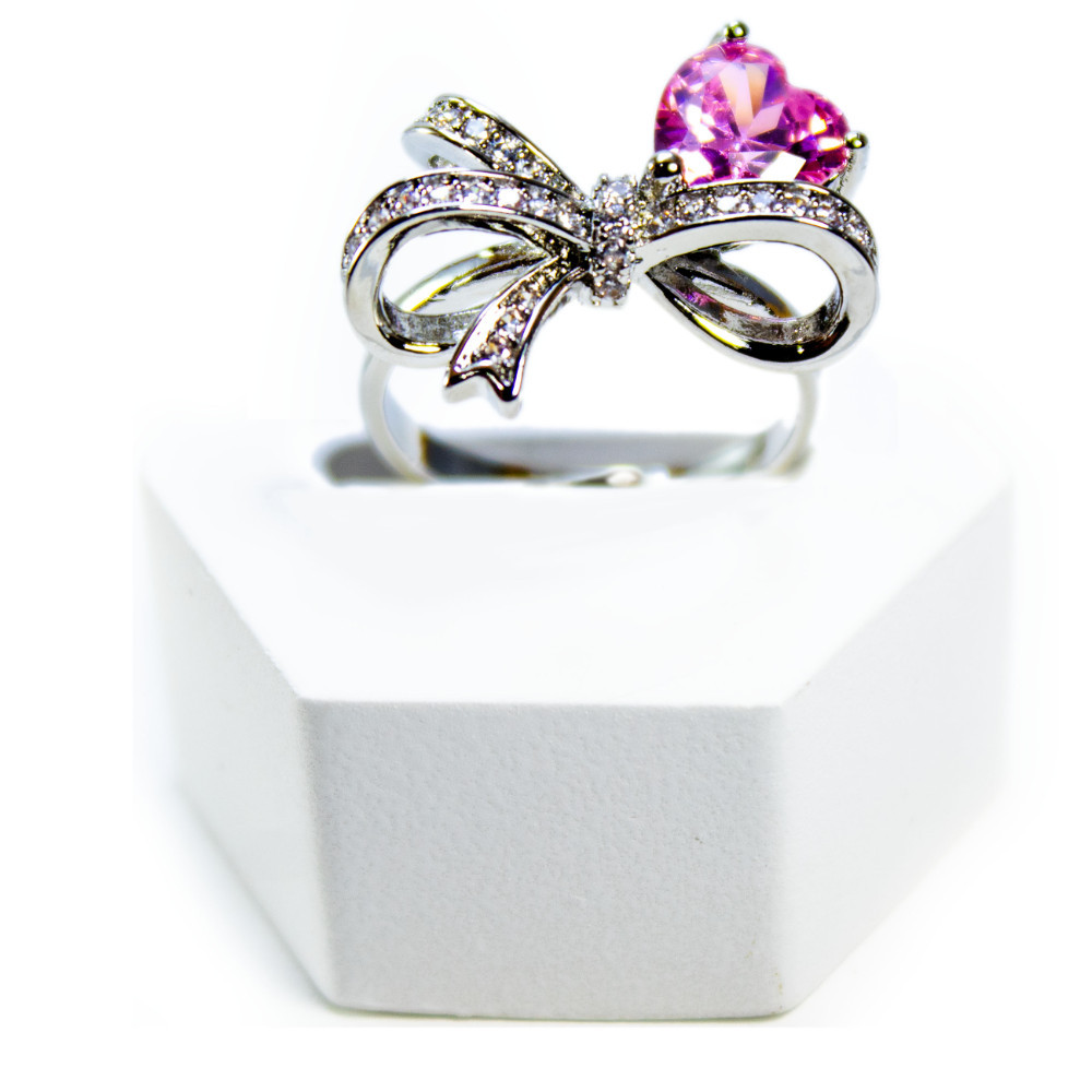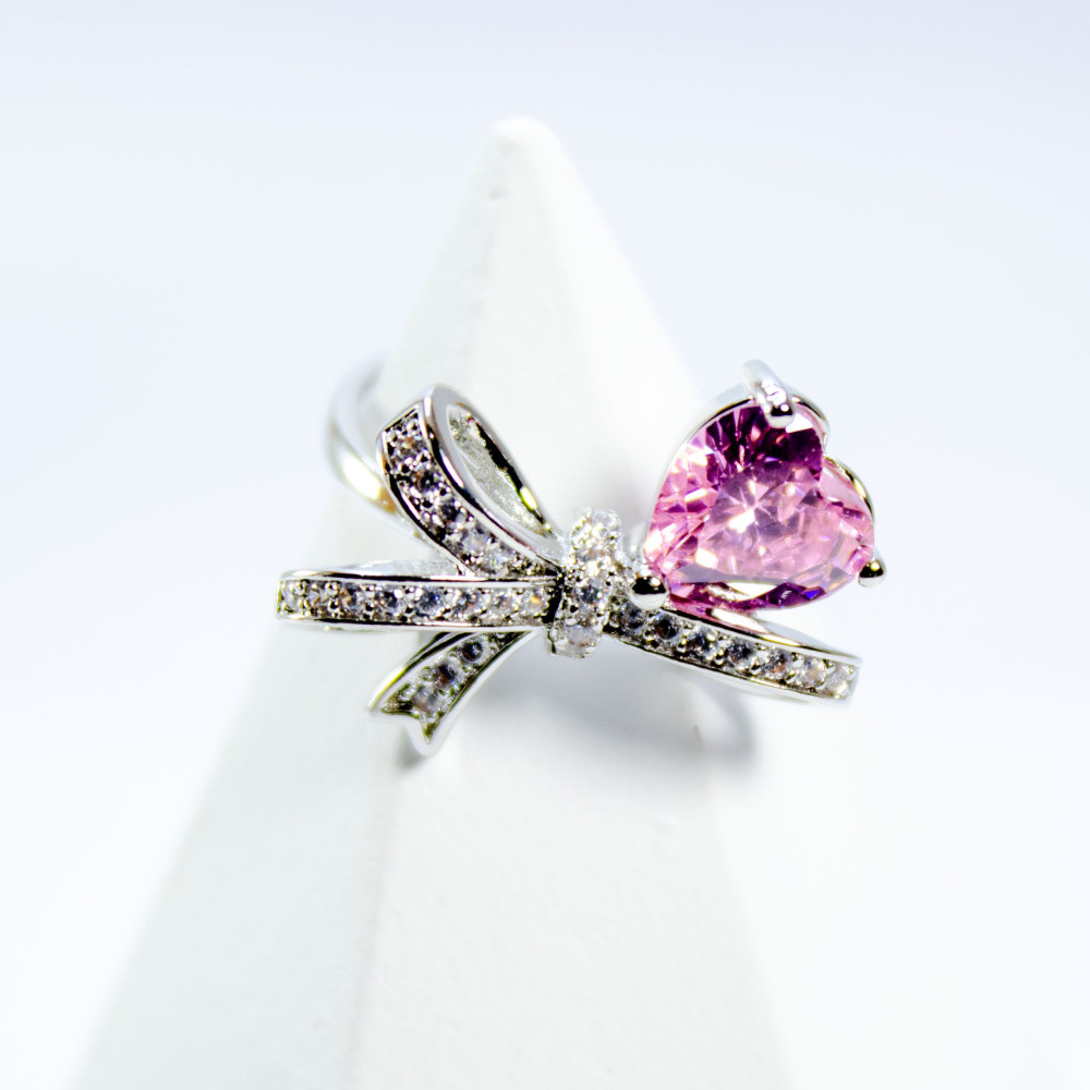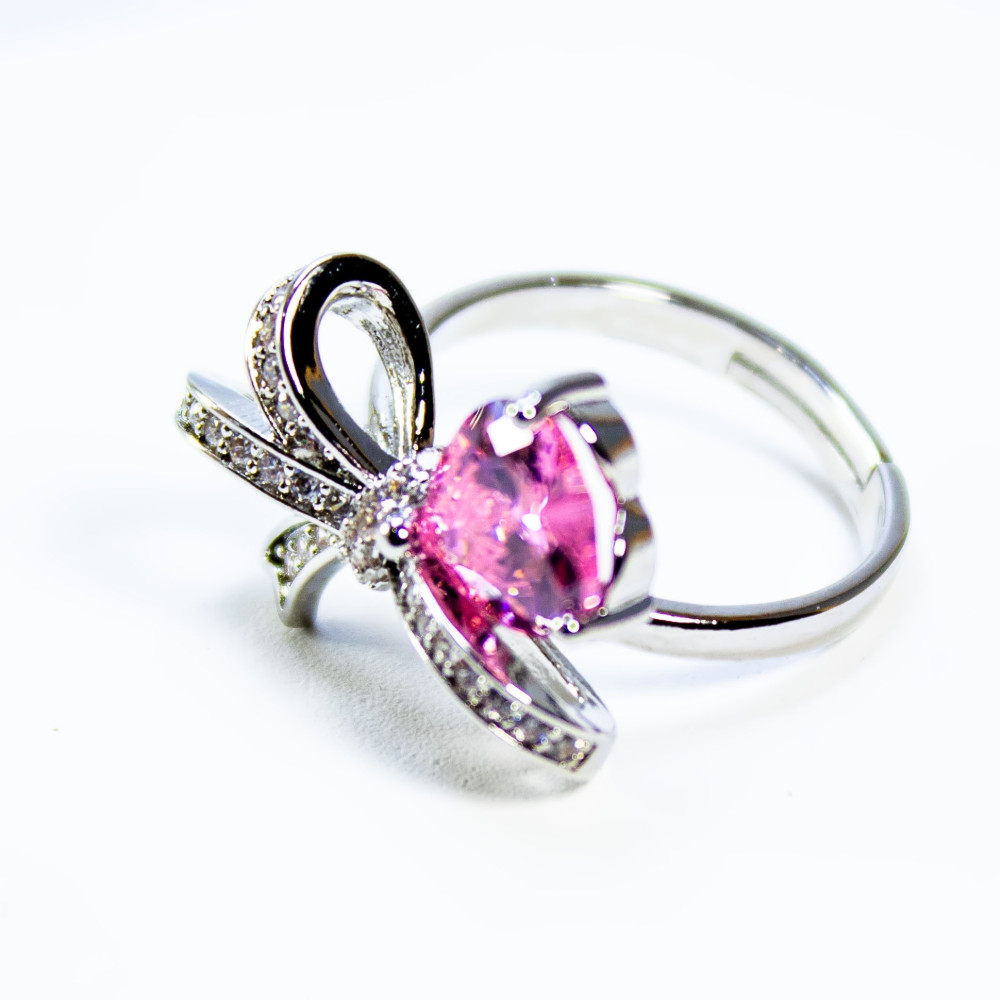 انگشتر فریسایز پاپیونی نگیندار با قلب صورتی درخشان