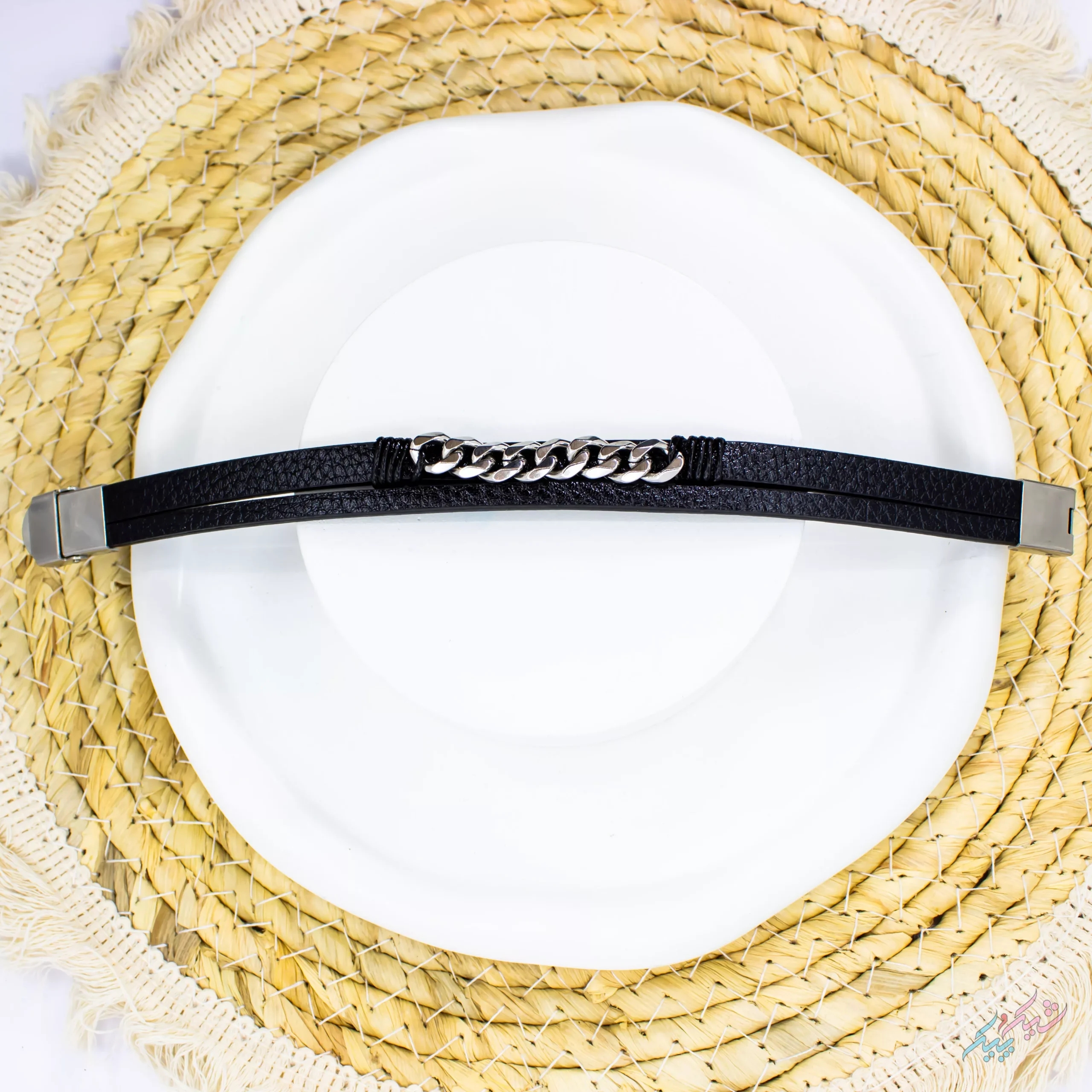شکل و ظاهر این دستبند بسیار مدرن و کارآمد است. ساختار آن از دو لایه تشکیل شده: لایه اول یک بند چرمی پهن و لایه دوم یک بند باریکتر یا بافت چرمی است که روی مچ دست شما قرار میگیرد. در مرکز این بندها، یک ردیف زنجیر محکم مدل کارتیر (یا حلقههای درهم) با رنگ نقرهای یا استیل قرار گرفته که نقطه کانونی دستبند است. ترکیب رنگ مشکی و نقرهای، یک کنتراست شیک و مینیمال ایجاد میکند که بهراحتی با لباسهای تیره، جین و استایلهای خیابانی (Street Style) سِت میشود. این دستبند دارای قفل محکم و قابل اطمینان است که استفاده روزانه از آن را آسان میسازد.