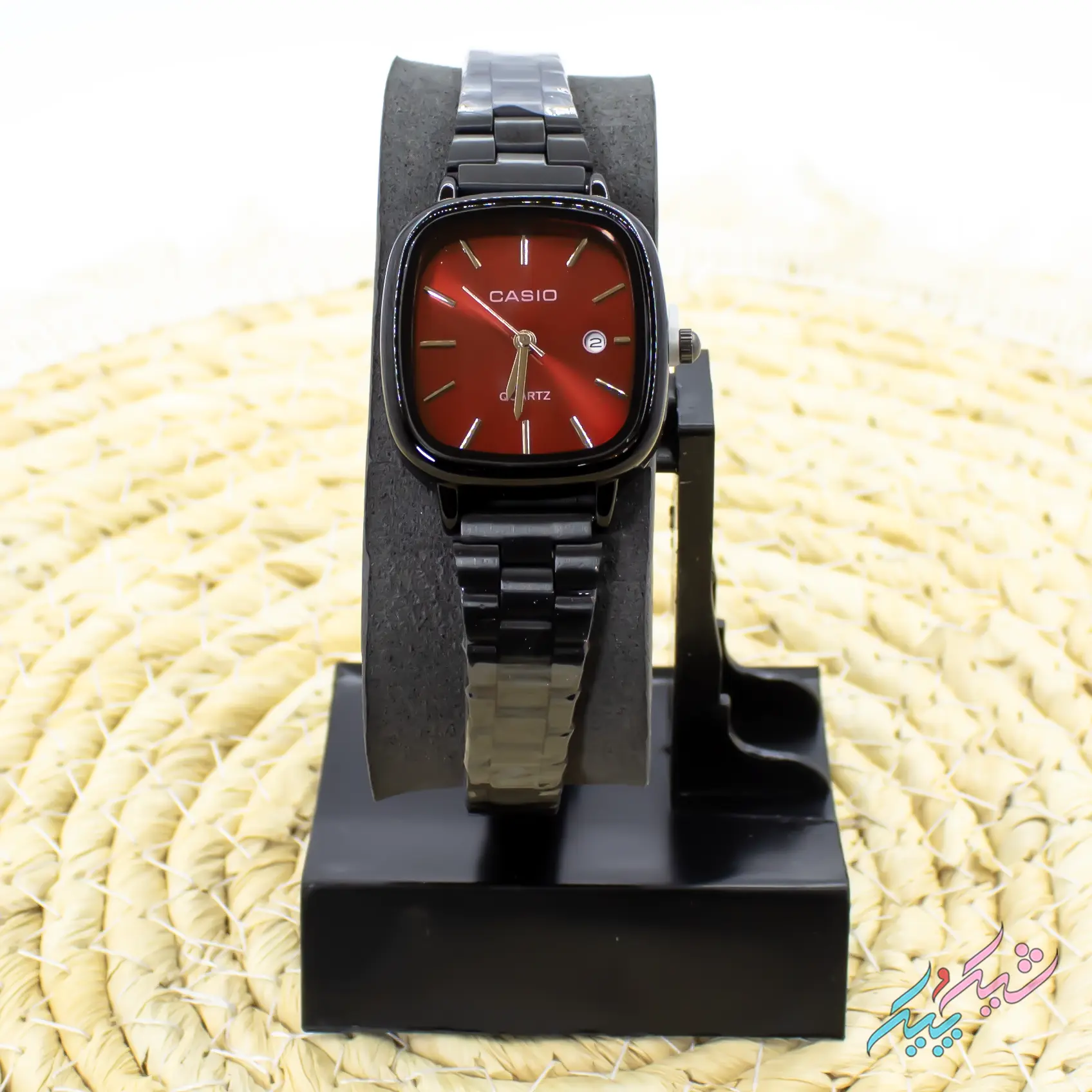 ساعت مچی زنانه طرح کاسیو مدل اولد مانی با صفحه قرمز و بند مشکی با تقویم فعال