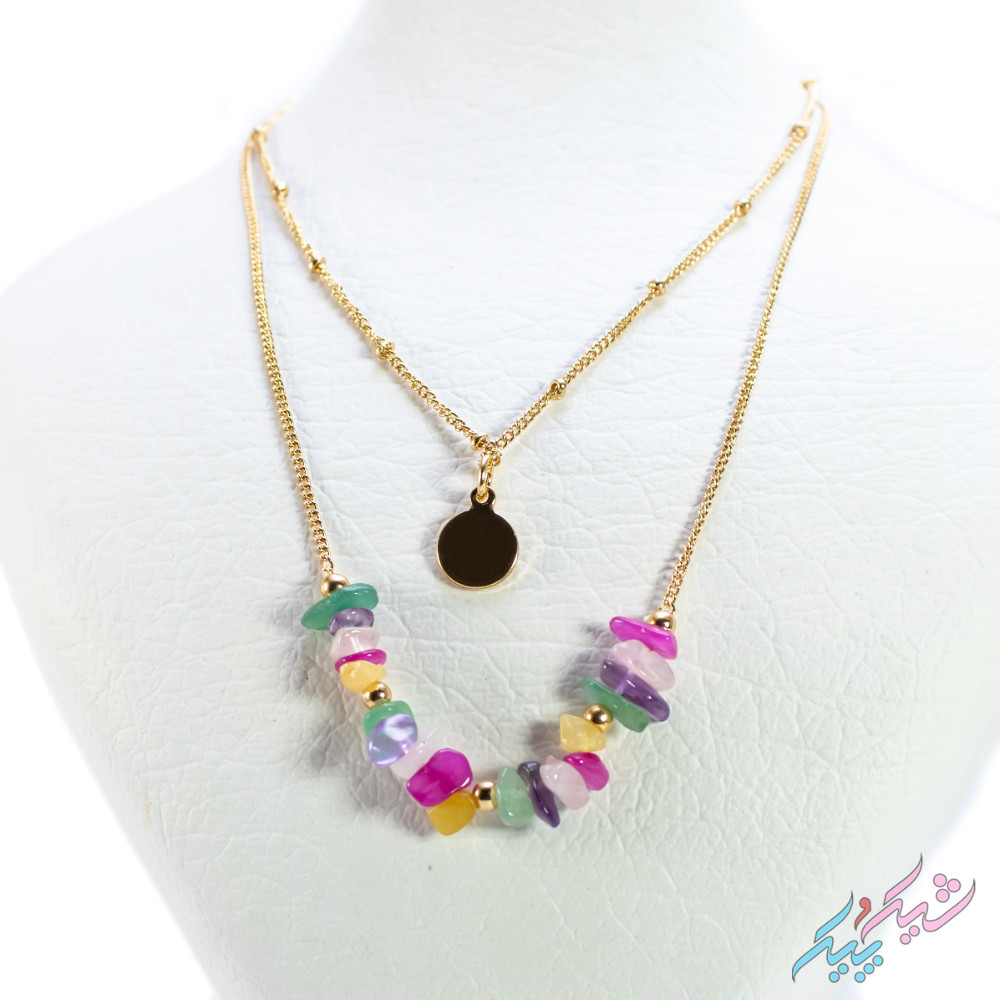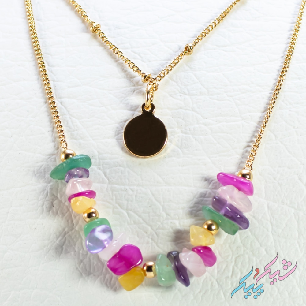 گردنبند دولاین دخترانه با سنگهای رنگی و پلاک طلایی