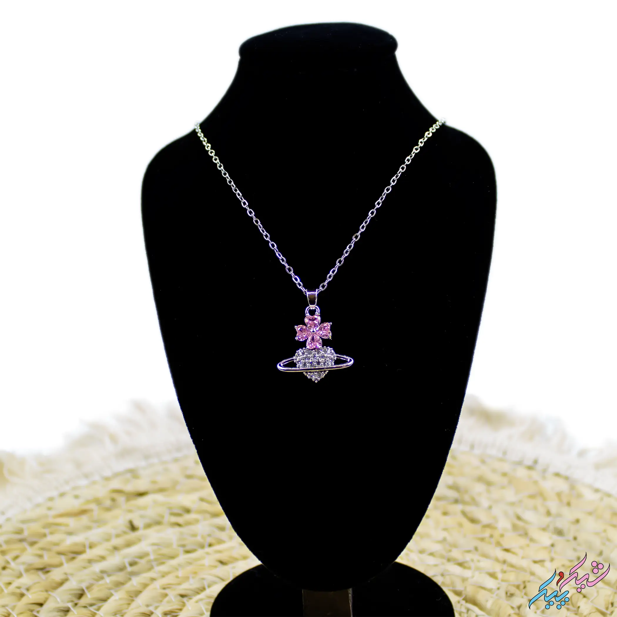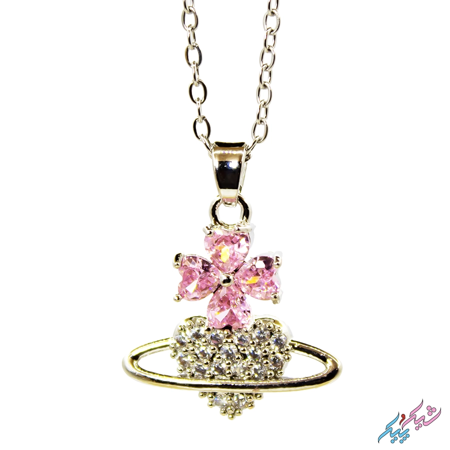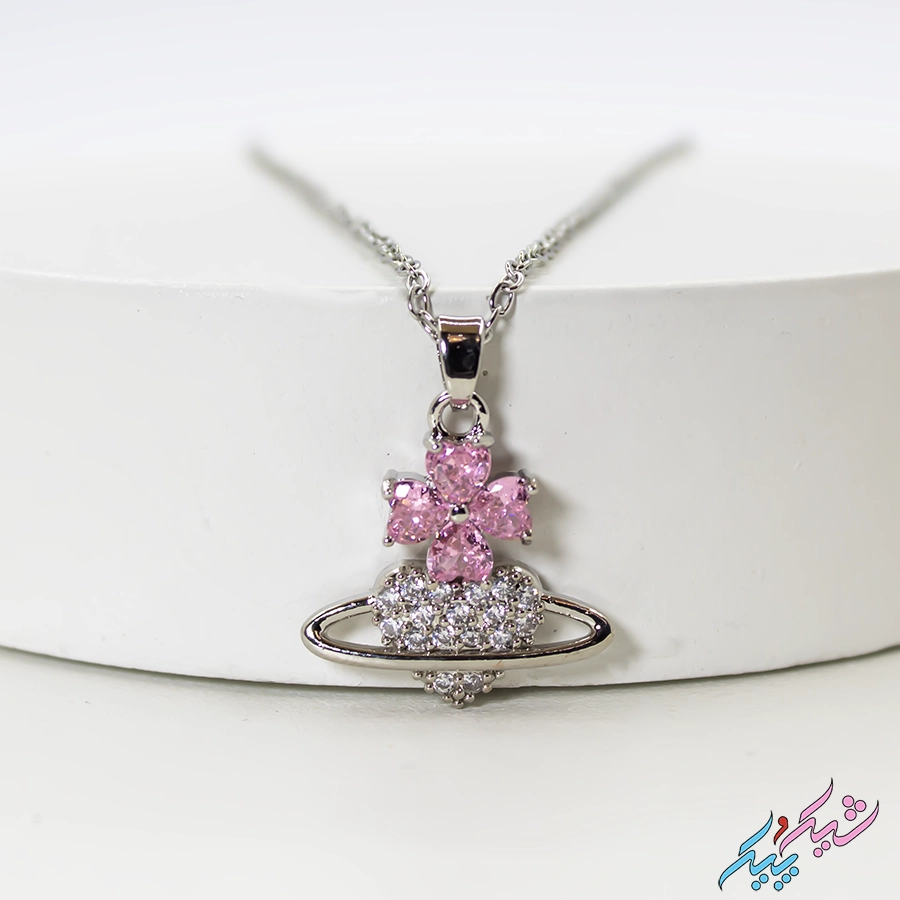 گردنبند طرح «سیاره شکوفه» با گل چهارپر صورتی و قلب نگین دار