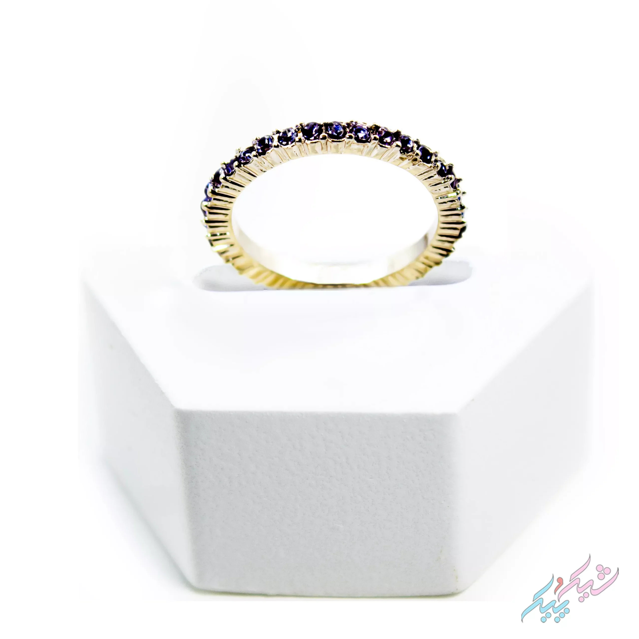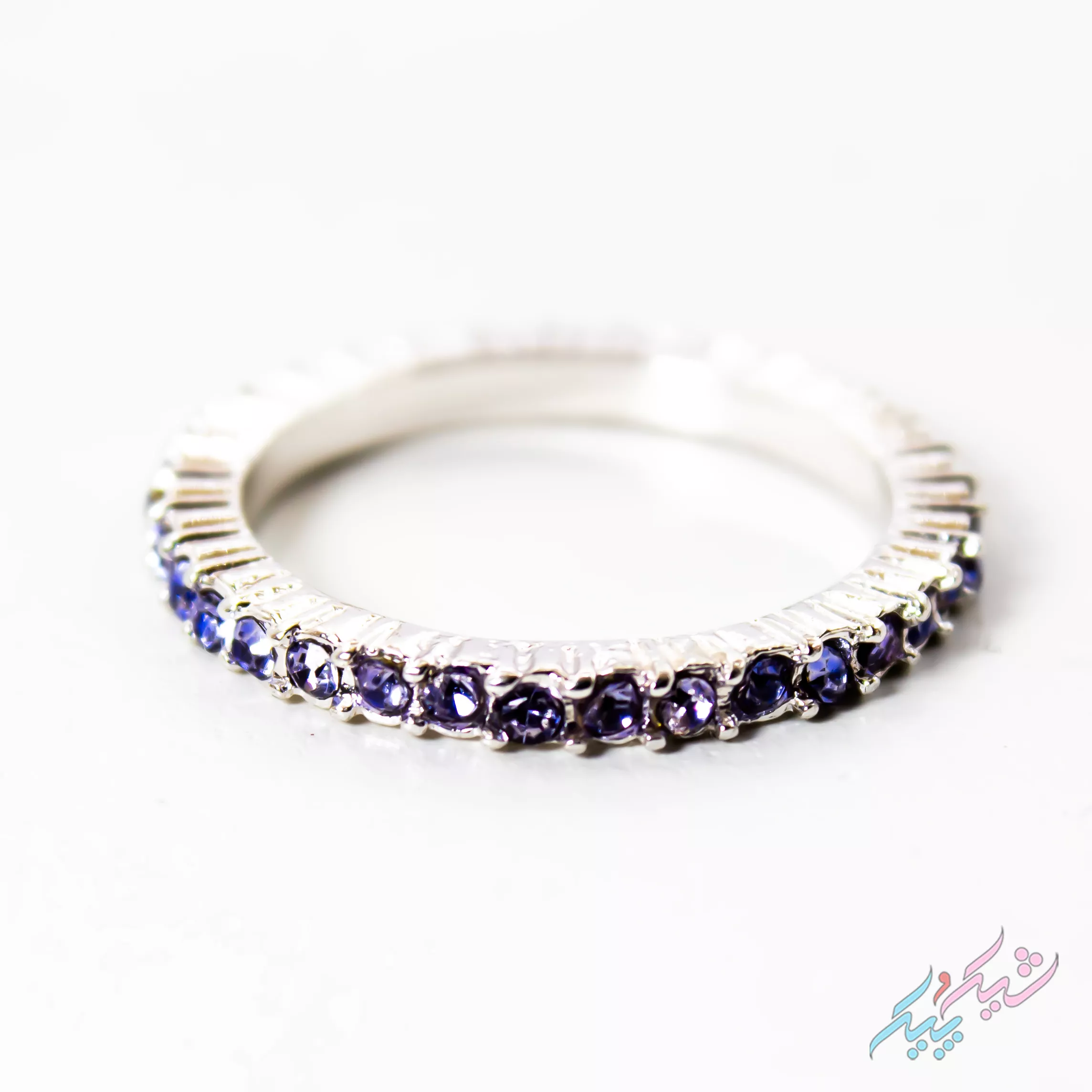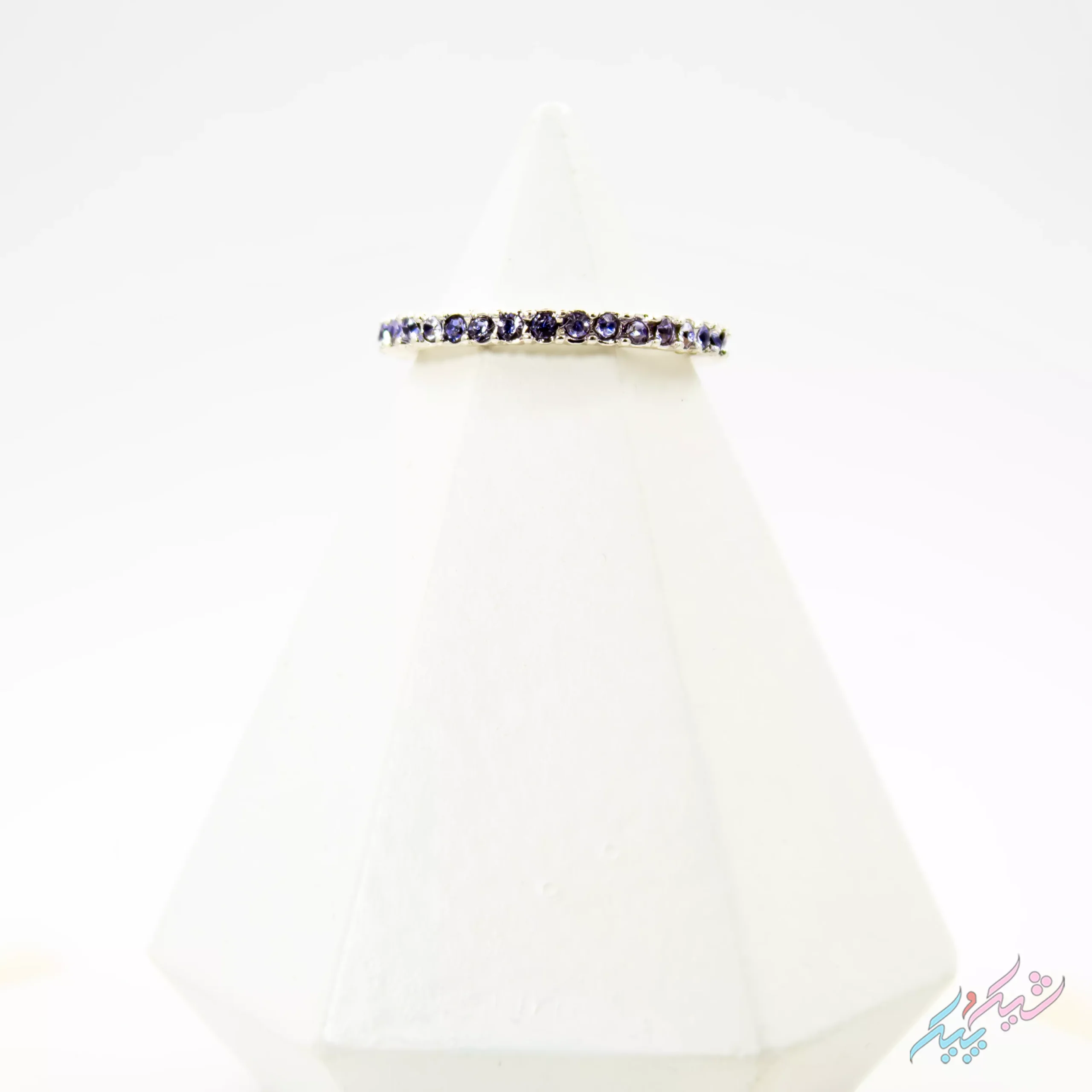 شکل و ظاهر این حلقه، ظرافت را به نهایت خود رسانده است. نگینهای بنفش که شبیه به یاقوت کبود (Sapphire Look) هستند، به صورت منظم و چسبیده به هم، یک نوار کامل را تشکیل میدهند. این طراحی، نمادی از عشق بیانتها و دوام است. لطافت این انگشتر در کنار درخشش مداوم نگینها، آن را به گزینهای بینظیر تبدیل کرده است. این مدل انگشتر که به شدت ترند شده، برای سِت کردن لایهای (Stacking) با حلقههای پهنتر یا رینگهای سادهتر عالی است. 💍