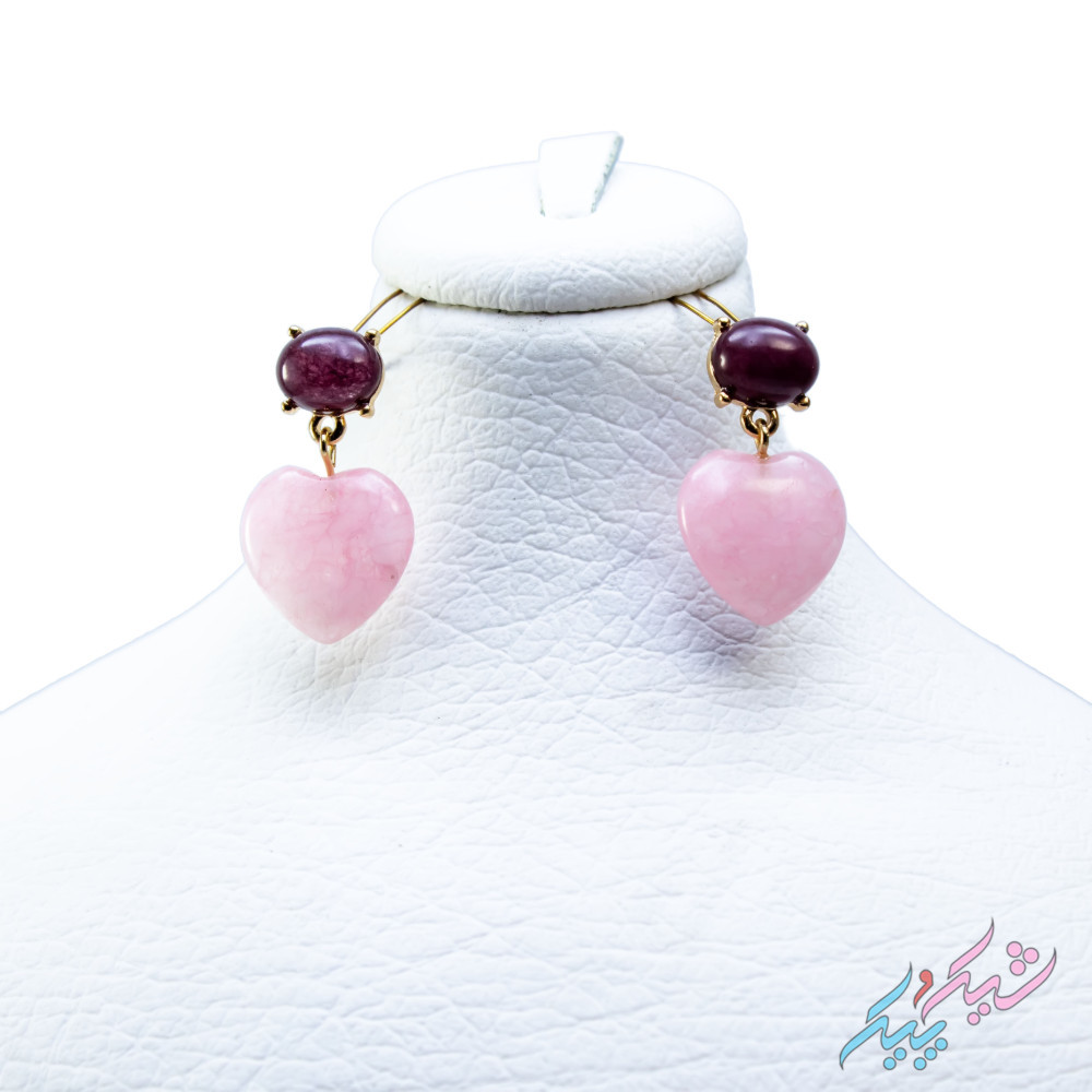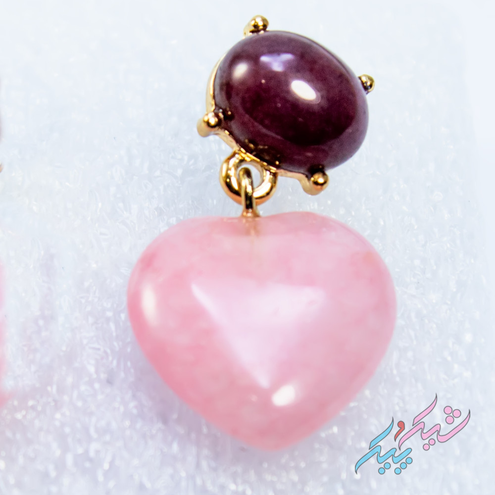 گوشواره میخی سنگ رز کوارتز قلبی به همراه یاقوت قرمز