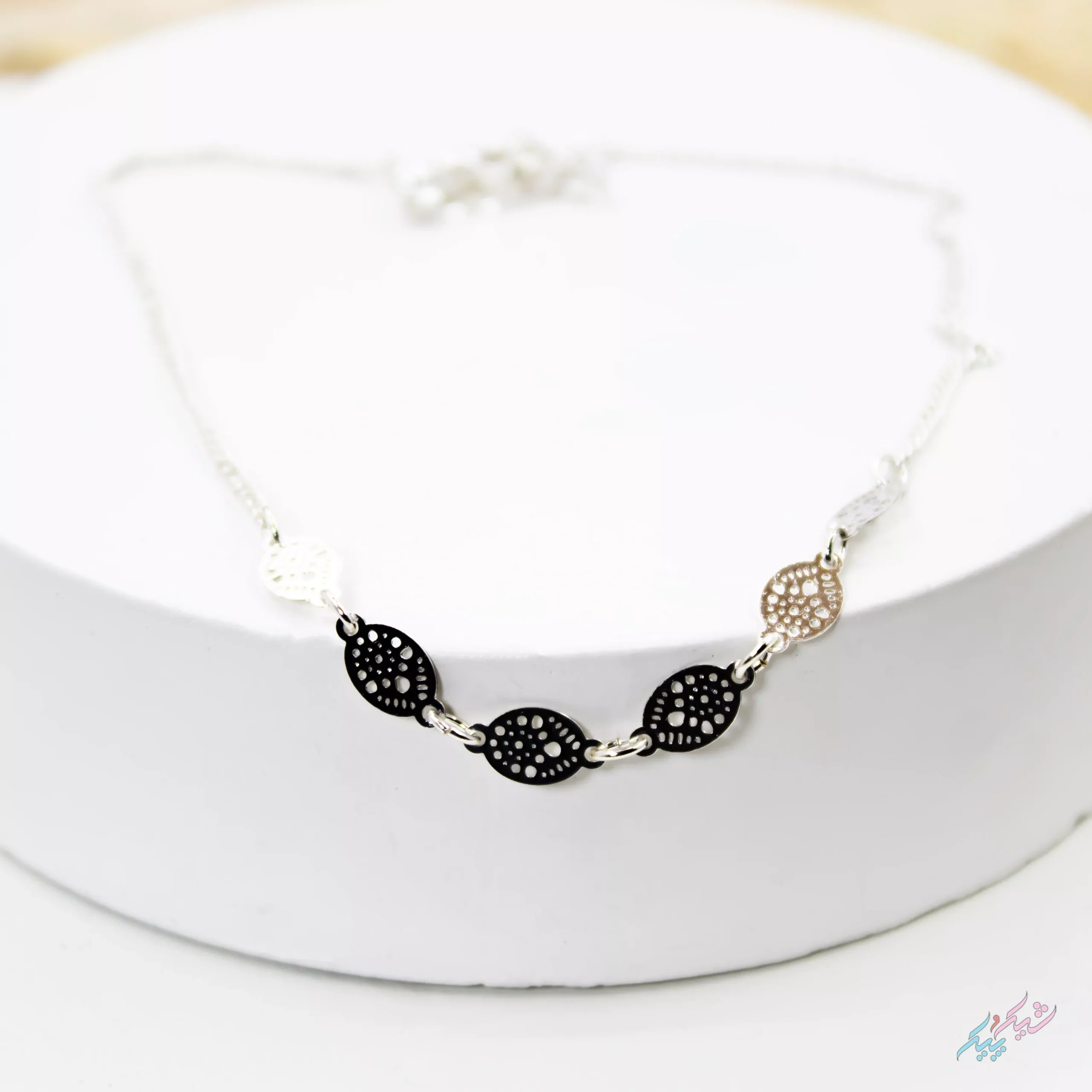 - لایه اول (بالاترین): یک زنجیر خاص با پلاکهای کوچک و بیضی شکل (شبیه به چشم) که با نقوش ظریف و سوراخدار تزئین شده و حالتی دایرهای و جذاب دارد. این لایه درخشش خاصی به پابند میبخشد.